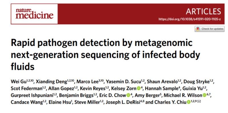 2020年11月09日,NATURE MEDICINE 雜志(IF:36.13)發(fā)表《Rapid pathogen detection by metagenomic next - generation sequencing of infec