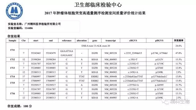 精科醫(yī)檢所再次一舉滿分通過了2017年首次全國腫瘤體細胞突變高通量測序檢測室間質評,擊敗全國近半實驗室。